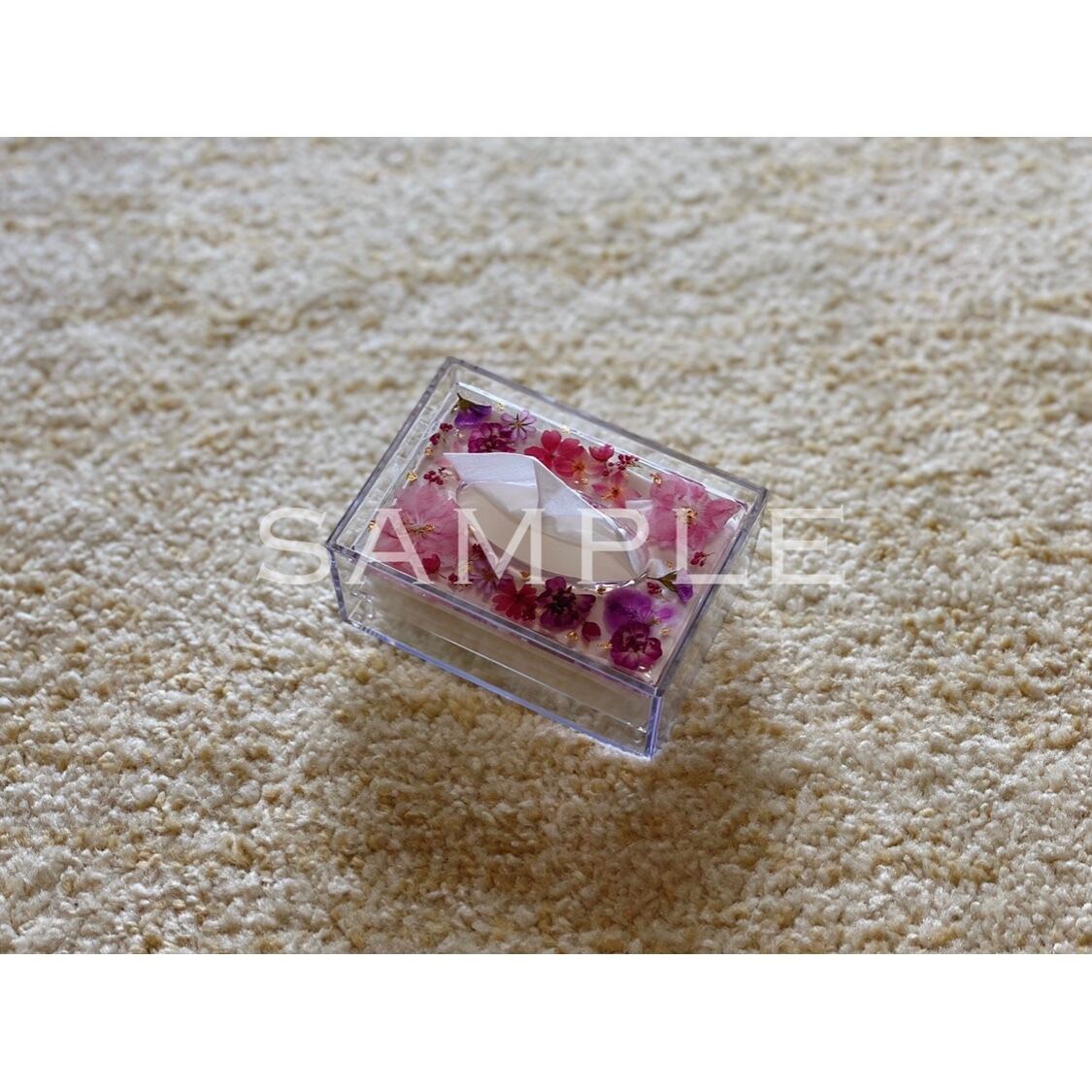 ❏ ポケットティッシュケースの蓋の部分に、押し花をたっぷり散りばめて可愛く仕上げます。